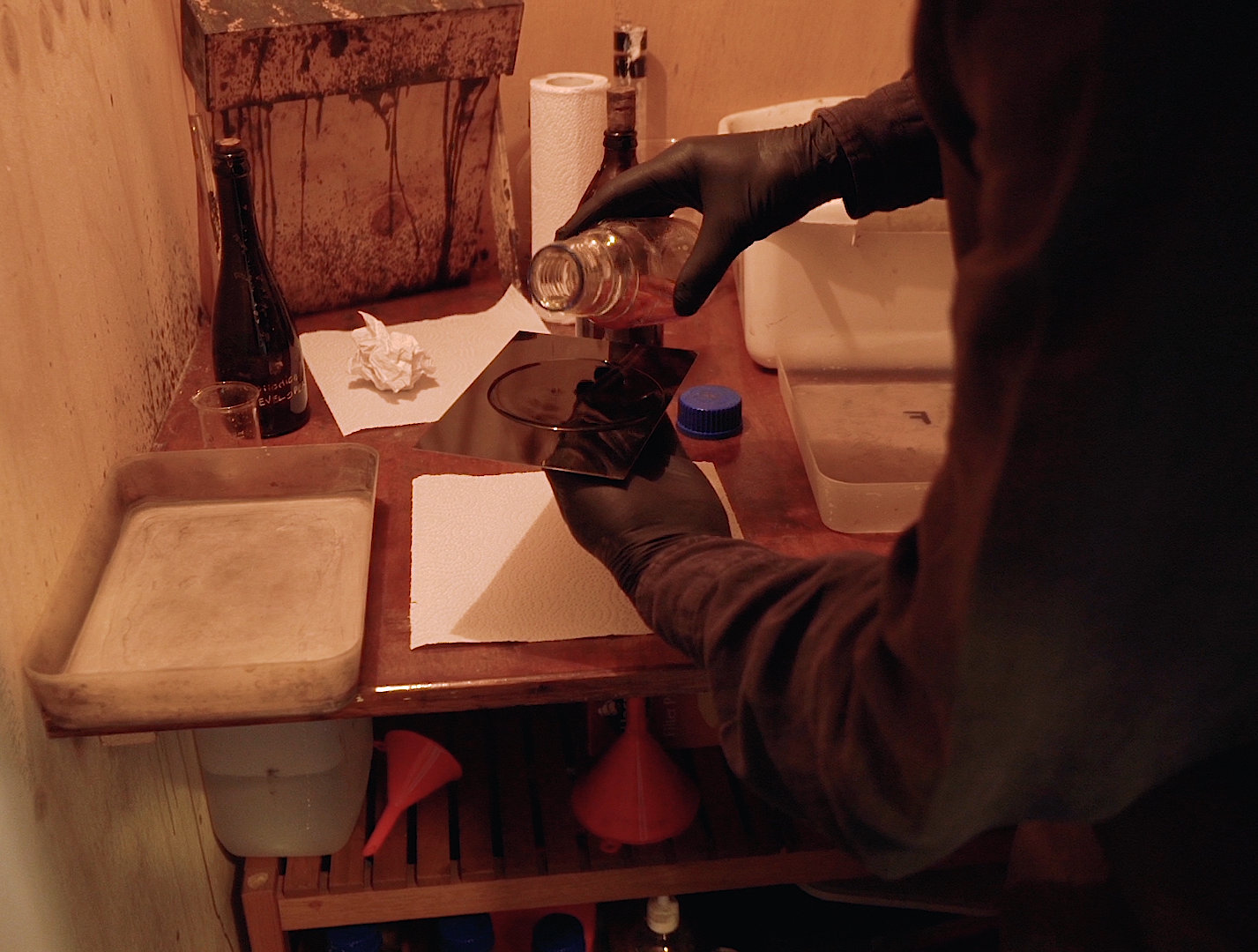4. The studio will be darkened and illuminated by a photographic red safelight for a minute or two during plate preparation and processing.